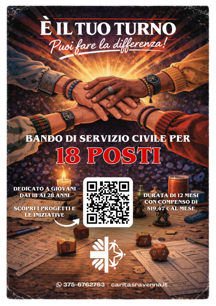La Caritas Diocesana di Ravenna-Cervia è presente nel bando con 3 progetti per un totale di 18 posti. Tutti i progetti proposti dalla Caritas Diocesana hanno una durata di 12 mesi. Prevedono un impegno di 25 ore alla settimana oppure di 1.145 ore nel corso dell’anno, su 5 giorni alla settimana ed è previsto un rimborso mensile di € 519,47.